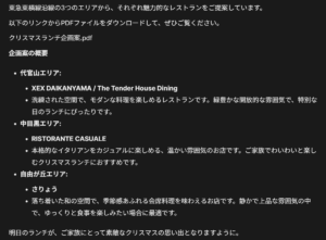 このように、web検索から、お勧めのレストランをピックアップし、企画を作成してくれました。