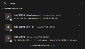 例えば、ブログ記事を書きたい場合、ライブラリから、ブログ記事をキーワードに検索すると、以下のように関連するアプリが見つかります。
